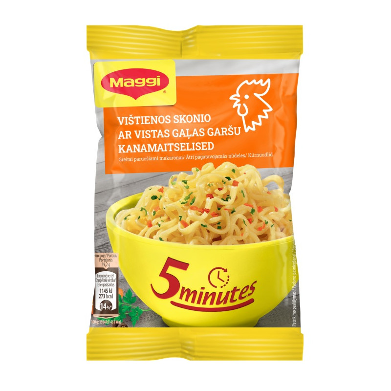 Makaronai 92,9% (KVIETINIAI miltai 72%, alyvpalmių aliejus, vanduo, bulvių krakmolas, druska, tešlos kildymo medžiagos (kalio karbonatas, natrio karbonatai)), prieskonių mišinys 7,1% (druska, cukrus, aromato ir skonio stiprikliai (mononatrio glutamatas, dinatrio guanilatas, dinatrio inozinatas), džiovintos daržovės 3,2% (morkos 2%, laiškiniai česnakai, svogūnai 0,46%, porai0,1%), kvapiosios medžiagos, prieskoniai ir prieskoniniai augalai 1,9% (ciberžolės, juodieji pipirai, SALIERŲ lapai, petražolių lapai), alyvpalmių aliejus, karamelizuotas cukrus, dažiklis (riboflavinai)). Sudėtyje gali būti KIAUŠINIŲ, PIENO, GARSTYČIŲ, SEZAMŲ, SOJŲ.