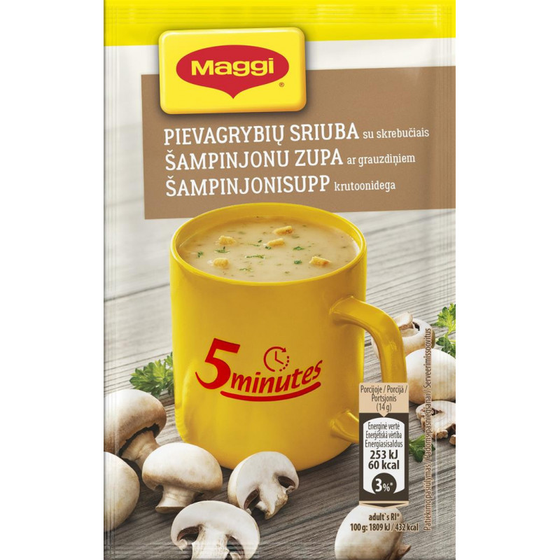 Bulvių krakmolas, skrebučiai 14,3% (KVIEČIŲ miltai, palmių aliejus, druska, mielės), palmių aliejus, druska, aromato ir skonio stiprikliai (mononatrio glutamatas, dinatrio 5'-ribonukleotidai), maltodekstrinas, džiovinti pievagrybiai (iš kurių pievagrybių koncentratas) 5,3%, kukurūzų krakmolas, gliukozės sirupas, LAKTOZĖ, paukštienos riebalai, džiovinti svogūnai 1,7%, kvapiosios medžiagos (su GLITIMU, SOJA, PIENU), PIENO baltymai, nugriebto PIENO milteliai, petražolių lapeliai, tirštiklis (ksantano derva), juodieji pipirai. Sudėtyje gali būti KIAUŠINIŲ, SALIERŲ ir GARSTYČIŲ. Sudėtyje yra: GLITIMO TURINČIŲ JAVŲ, PIENO IR JO PRODUKTŲ (ĮSKAITANT LAKTOZĘ), SOJŲ PUPELIŲ IR JŲ PRODUKTŲ.