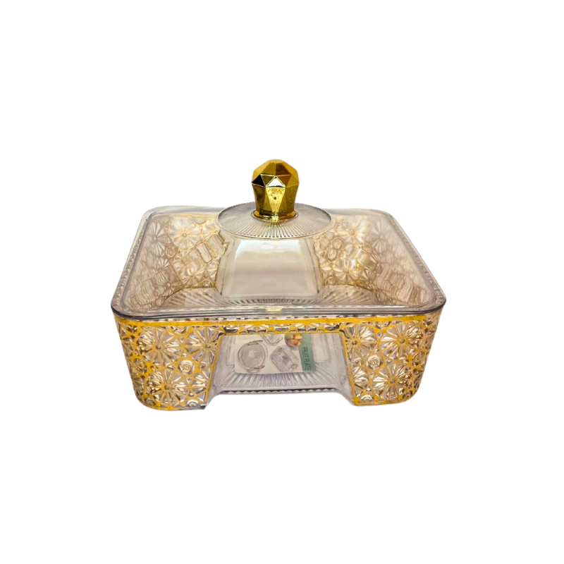 Elegantiškas plastikinis indas su dekoratyviniu auksiniu raštu ir stilingu, brangakmenį primenančiu dangčio rankenėliu. Puikiai tinka saldumynams, vaisiams, sausainiams ar užkandžiams patiekti šventėse bei kasdienybėje. Skaidrus dizainas leidžia matyti turinį, o dangtis apsaugo nuo dulkių ir išlaiko maisto šviežumą.