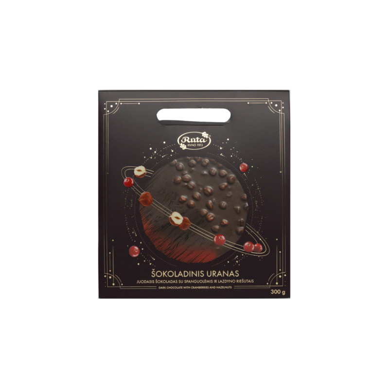 Gamintojas: Kilmės šalis: Lietuva Grynasis kiekis: 100g Juodasis šokoladas RŪTA su spanguolėmis