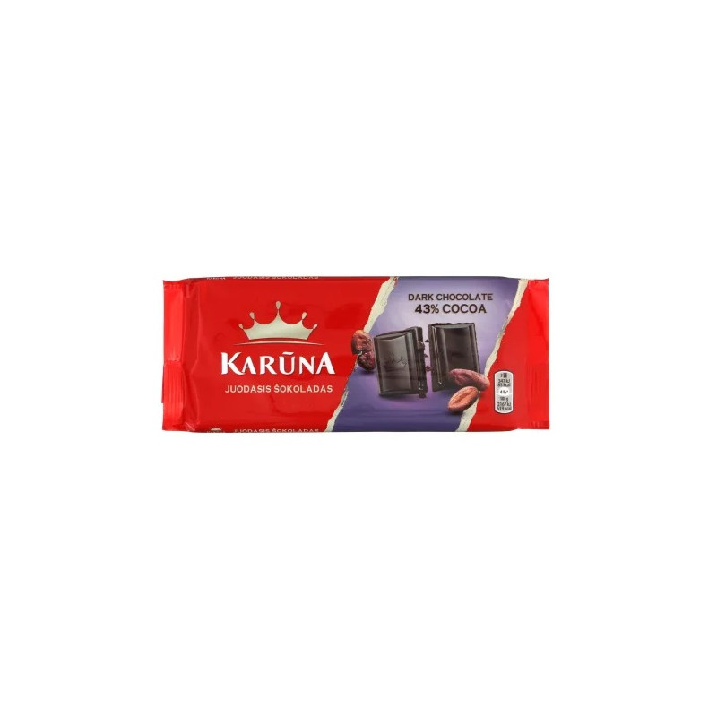 Cukrus, trinta kakava, kakavos sviestas, PIENO riebalai, emulsikliai (SOJŲ lecitinai, E476), kvapioji medžiaga, nugriebto PIENO milteliai. Šokolade kakavos sausųjų medžiagų – ne mažiau kaip 43%. Gali būti RIEŠUTŲ.