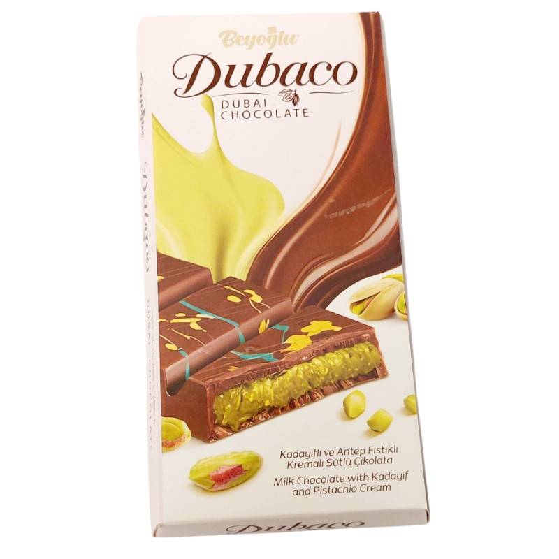 Cukrus, PISTACIJOS 17%, kakavos sviestas, nenugriebto PIENO milteliai, KATAYIF tešla 7,5% (KVIETINIAI miltai (turi GLITIMO), vanduo), kakavos masė, SVIESTO riebalai (iš PIENO), augalinis aliejus (palmių), demineralizuoti IŠRŪGŲ milteliai (iš PIENO), emulsikliai (saulėgrąžų/SOJŲ lecitinai), dažikliai (spirulinų ekstraktas, liuteinas), kvapioji medžiaga vanilinas. Kakavos sausųjų medžiagų šokolade ne mažiau kaip 25%. Galimi nedideli kiekiai ŽEMĖS RIEŠUTŲ, LAZDYNO RIEŠUTŲ ir MIGDOLŲ.