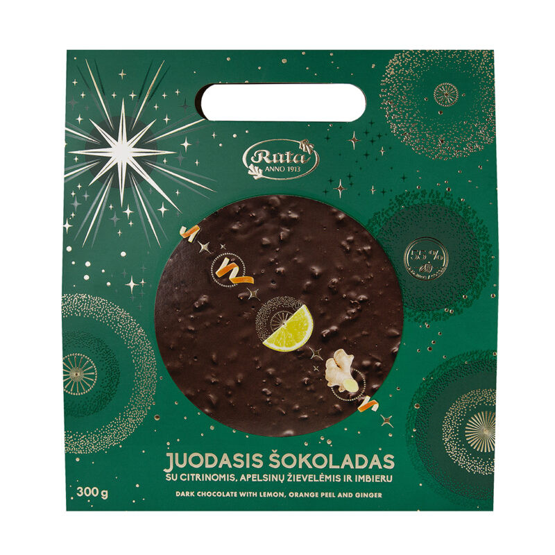 Šokoladas (kakavos masė, cukrus, kakavos sviestas, emulsikliai (SOJŲ lecitinas, natūrali vanilės kvapioji medžiaga), citrinų granulės 3 % (gliukozės sirupas, koncentruotos citrinų sultys (10 %), cukruoti abrikosai, modifikuotas bulvių krakmolas, tirštiklis E 401, kvapioji medžiaga), apelsinų žievelės 3 % (apelsinų žievelės (53 %), cukrus, gliukozės-fruktozės sirupas, rūgštingumą reguliuojanti medžiaga citrinų rūgštis), džiovintas imbieras 2 % (imbieras (83,5 %), cukrus, fruktozės sirupas, koncentruotos citrinų sultys). DAUG SKAIDULINIŲ MEDŽIAGŲ. Šokolade kakavos sausųjų medžiagų – ne mažiau kaip 55 %.