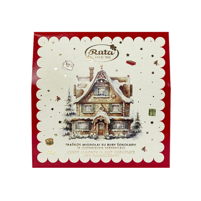 Ruby šokoladas 62 % (cukrus, kakavos sviestas, nenugriebto PIENO milteliai, kakavos masė, emulsiklis SOJŲ lecitinas, rūgštis (citrinų rūgštis), natūrali vanilės kvapioji medžiaga), MIGDOLAI (25 %), cukrus, džiovinti šaltyje juodieji serbentai (1,5 %), glajinės medžiagos (tapijokų krakmolas, šelakas). SKAIDULINIŲ MEDŽIAGŲ ŠALTINIS. Ruby šokolade kakavos sausųjų medžiagų – ne mažiau kaip 41,8 %.