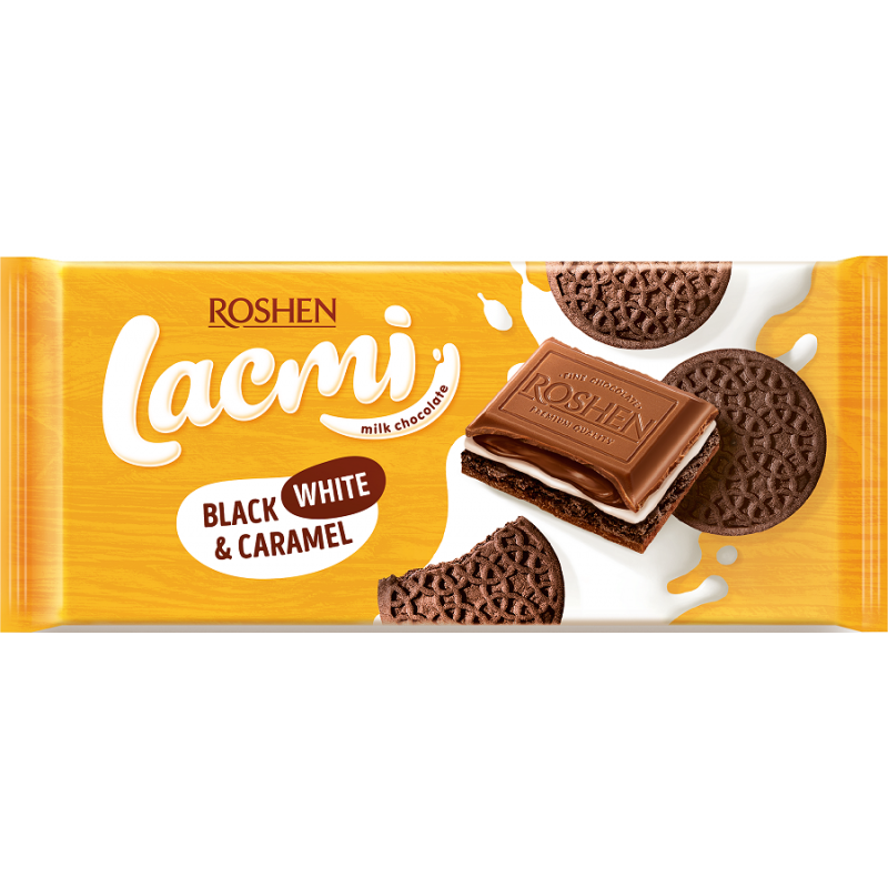 Pieninis šokoladas „Lacmi black, white&caramel” su pieniniu įdaru 25%, karamele 8% ir kakaviniais sausainiais 20%. Įdare pieno produktų 31%