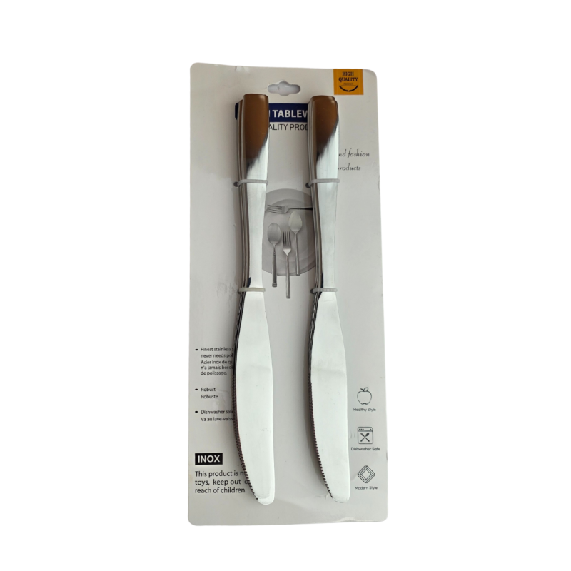 Kokybiški nerūdijančio plieno stalo peiliai su patogiomis rankenomis. Aštrūs dantyti ašmenys leidžia lengvai pjaustyti įvairius produktus, o subalansuotas dizainas suteikia patogumo naudojant. Blizgus paviršius ir moderni forma suteikia stalui elegancijos.