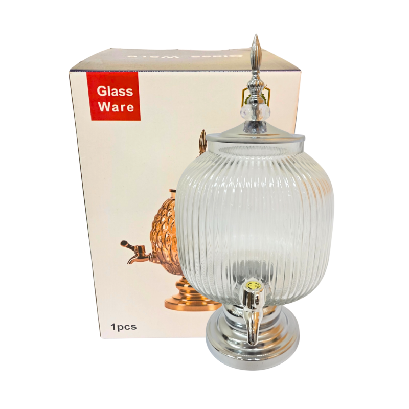Stilingas ir talpus 5 litrų gėrimų dozatorius, pagamintas iš aukštos kokybės briaunuoto stiklo. Sidabrinės detalės ir dekoratyvinis dangtelis suteikia prabangos, todėl dozatorius puikiai tiks tiek kasdieniam naudojimui, tiek šventėms ar vaišėms lauke. Patogus kranelis leidžia lengvai ir tvarkingai pilstyti gėrimus, o stabilus pagrindas garantuoja saugų naudojimą.