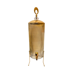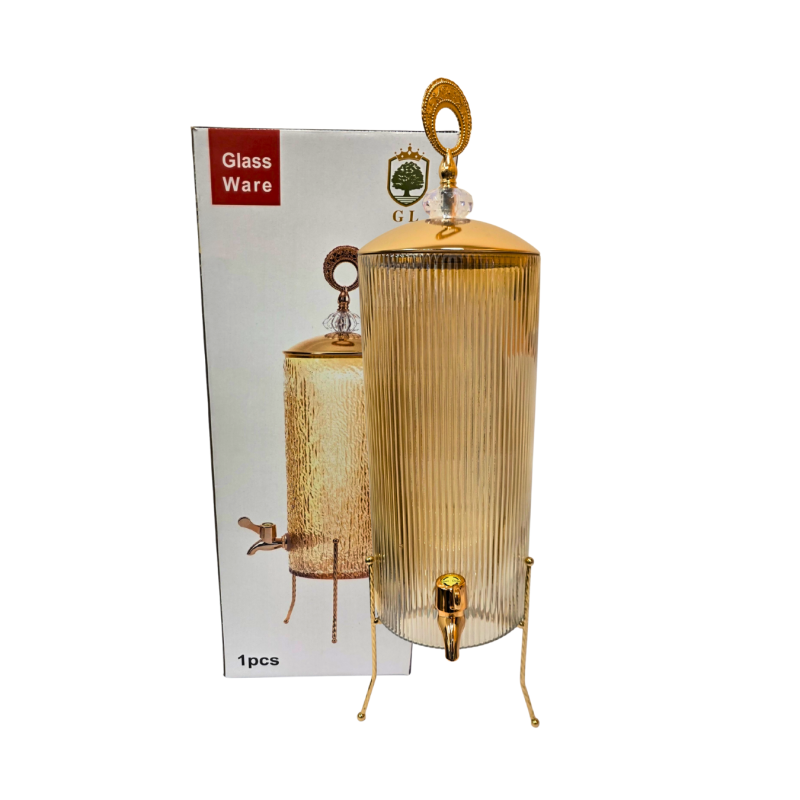 Šis elegantiškas 4 litrų talpos gėrimų dozatorius išsiskiria moderniu vertikalių linijų stiklo dizainu ir prabangiais auksuotais akcentais. Skaidrus, tvirtas stiklas leidžia gražiai matyti gėrimo spalvą, o dekoratyvinis dangtelis su kristalo detale suteikia išskirtinumo. Dozatorius komplektuojamas su dailiu metaliniu stovu, kuris užtikrina stabilumą ir patogų gėrimo pilstymą.
