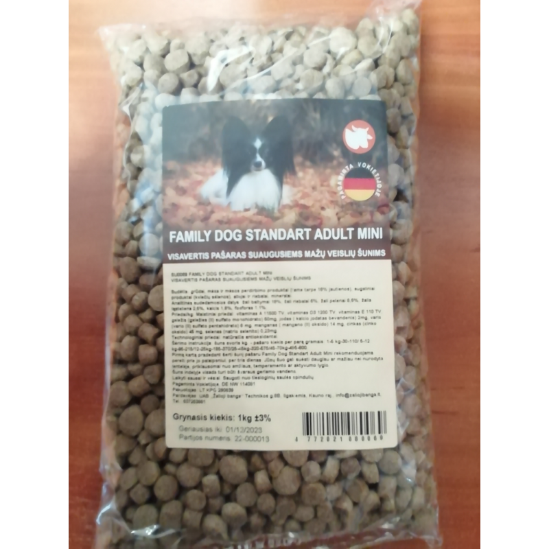 PAPILDOMA INFORMACIJA, SAUGA: Pirmą kartą pradedant šerti šunį pašaru Family Dog Standart Adult Mini rekomenduojama pereiti prie jo palaipsniui, per tris dienas. Jūsų šuo gali suėsti daugiau ar mažiau nei nurodyta lentelėje, priklausomai nuo amžiaus, temperamento ar aktyvumo lygio. Šuns indelyje visada turi būti švaraus geriamo vandens.