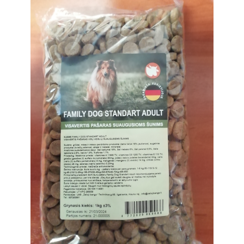 PAPILDOMA INFORMACIJA, SAUGA: Pirmą kartą pradedant šerti šunį pašaru Family Dog Standart Adult Mini rekomenduojama pereiti prie jo palaipsniui, per tris dienas. Jūsų šuo gali suėsti daugiau ar mažiau nei nurodyta lentelėje, priklausomai nuo amžiaus, temperamento ar aktyvumo lygio. Šuns indelyje visada turi būti švaraus geriamo vandens.
