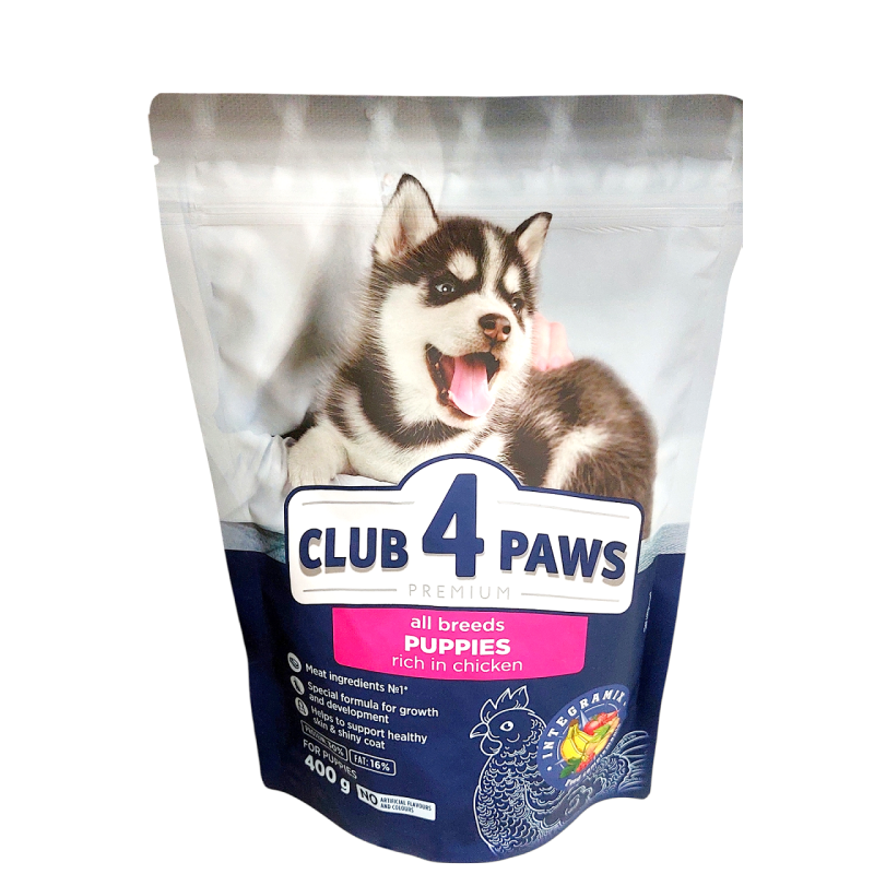 CLUB 4 PAWS PREMIUM VISŲ VEISLIŲ ŠUNIUKAMS ,,SU DIDELIU VIŠTIENOS KIEKIU“. VISAVERTIS SAUSAS PAŠARAS.