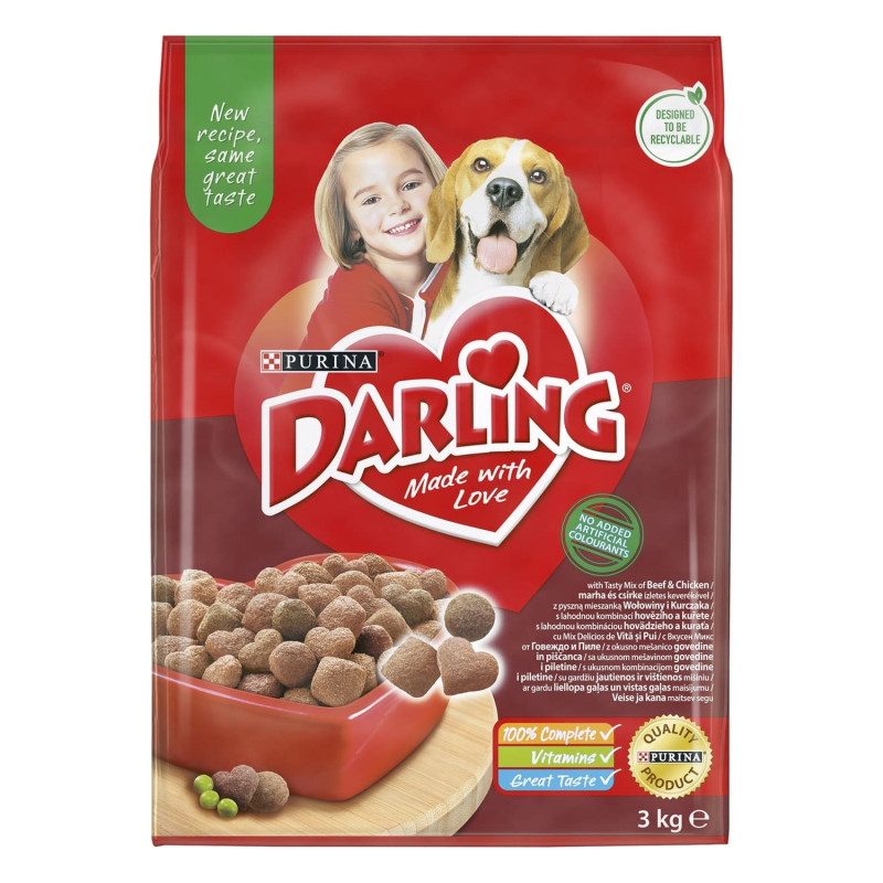 ,,Darling Dog“ su gardžiu jautienos ir vištienos mišiniu. Visavertis ėdalas suaugusiems šunims.