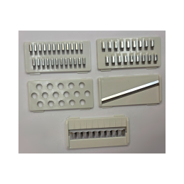 Rinkinyje esantys 5 keičiamieji peilių ir trintuvės antgaliai suteikia galimybę pjaustyti plonais griežinėliais, kubeliais, smulkinti, tarkuoti ar formuoti dekoratyvinius pjūvius. Visi antgaliai lengvai keičiami ir saugiai įsistato į dangtį.