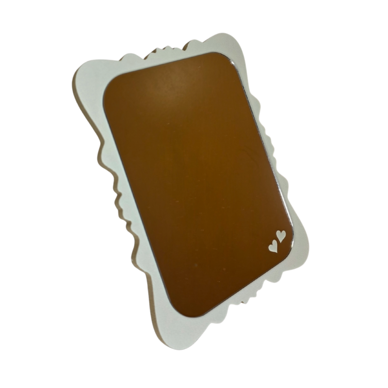 Stilingas ir lengvas dekoro veidrodis su banguotais kraštais ir dviem mažais širdelių akcentais kampe. Puikiai tinka tiek kosmetiniam naudojimui, tiek kaip interjero detalė.