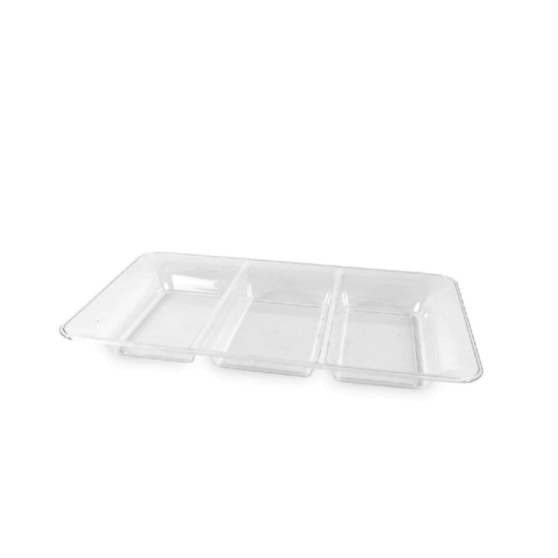 Skaidri ir universali užkandžių lėkštė su trimis patogiais skyriais — puikus pasirinkimas šventėms, piknikams ar kasdieniam patiekalų patiekimui. Puikiai tinka daržovėms, užkandžiams, padažams ar mažiems desertams atskirai serviruoti.