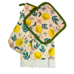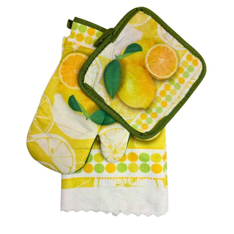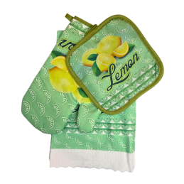 Virtuvinis rinkinys, kurį sudaro: pirštinė, puodų padėkliukas ir rankšluostis