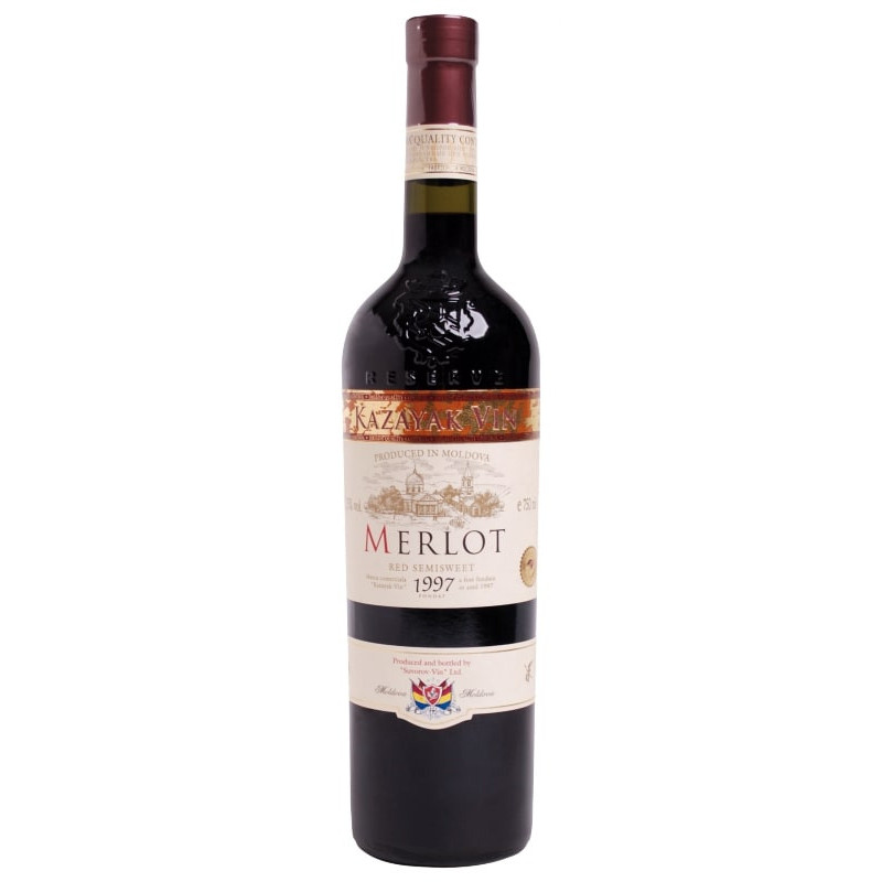 Pusiau saldus "Merlot" vynuogių veislės raudonasis vynas. Tamsios rubino spalvos, malonaus aromato bei aksominio skonio.