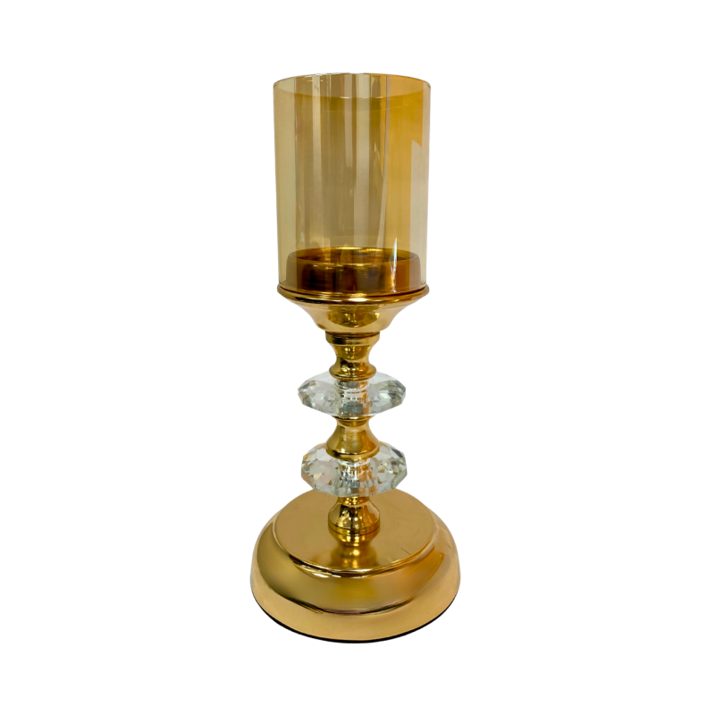 Prabangi ir dekoratyvi žvakidė, išsiskirianti auksiniu blizgesiu bei elegantiškomis stiklo (kristalo imitacijos) detalėmis. Puikiai tinka stalo, židinio ar interjero dekorui, suteikia jaukumo ir prabangos pojūtį.
